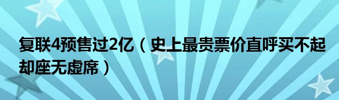4、截至2019年4月14日下午14:56:07,据猫眼电影数据显示,复联4预售过2亿元总票房,实际上,它在预售不到一小时的时间里,已经突破了1000万,当天晚上10点时,预售票房已经破亿,成功创下了中国的影史记录,“抢票之战”,简直堪比春运,量价齐涨的情况下,虽然史上最贵票价直呼买不起却座无虚席。