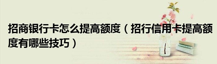 导读 大家好,综合小编来为大家讲解下。招商银行卡怎么提高额度,招行信用卡提高额度有哪些技巧这个很多人还不知道,现在让我们一起来看看吧!1、