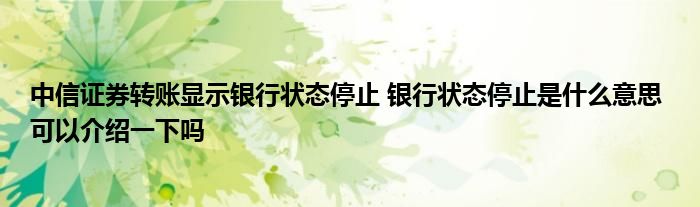 大家好,小呗来为大家解答以上的问题中信证券转账显示银行状态停止,银行状态停止是什么意思,可以介绍一下吗这个很多人还不知道,现在让我们一起来了解下吧!