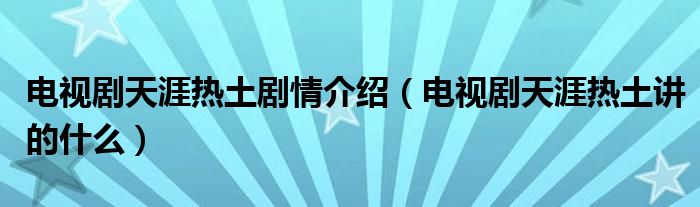 导读 大家好,小齐来为大家解答以上问题。电视剧天涯热土剧情介绍,电视剧天涯热土讲的什么很多人还不知道,现在让我们一起来看看吧!1、电视剧