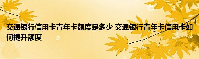 导读 大家好,小元来为大家解答问题。交通银行信用卡青年卡额度是多少,交通银行青年卡信用卡如何提升额度这个很多人还不知道,现在让我们一起来
