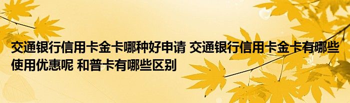 导读 大家好,小元来为大家解答问题。交通银行信用卡金卡哪种好申请,交通银行信用卡金卡有哪些使用优惠呢,和普卡有哪些区别这个很多人还不知道