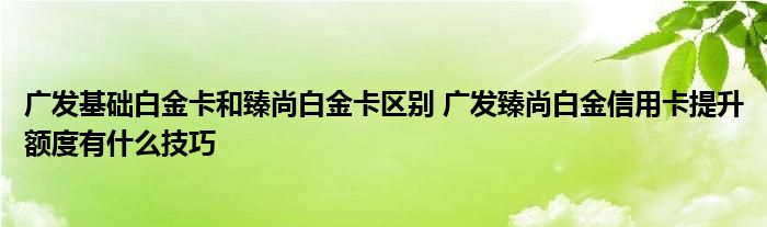 导读 大家好,小元来为大家解答问题。广发基础白金卡和臻尚白金卡区别,广发臻尚白金信用卡提升额度有什么技巧这个很多人还不知道,现在让我们一