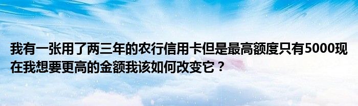 大家好,小元来为大家解答问题。我有一张用了两三年的农行信用卡但是最高额度只有5000现在我想要更高的金额我该如何改变它?这个很多人还不知道,现在让我们一起来了解下吧!