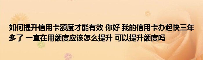 大家好,小元来为大家解答问题。如何提升信用卡额度才能有效,你好,我的信用卡办起快三年多了,一直在用额度应该怎么提升,可以提升额度吗这个很多人还不知道,现在让我们一起来了解下吧!