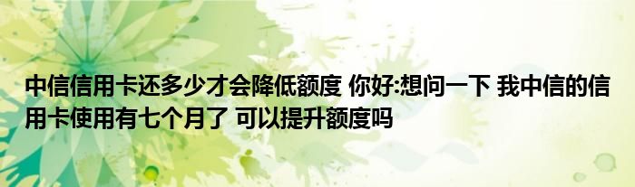 导读 大家好,小元来为大家解答问题。中信信用卡还多少才会降低额度,你好:想问一下,我中信的信用卡使用有七个月了,可以提升额度吗这个很多人