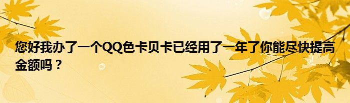 大家好,小元来为大家解答问题。您好我办了一个QQ色卡贝卡已经用了一年了你能尽快提高金额吗?这个很多人还不知道,现在让我们一起来了解下吧!