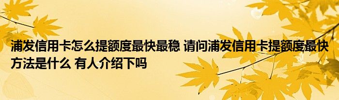 导读 大家好,小元来为大家解答问题。浦发信用卡怎么提额度最快最稳,请问浦发信用卡提额度最快方法是什么,有人介绍下吗这个很多人还不知道,现