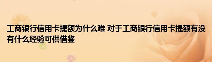 大家好,小元来为大家解答问题。工商银行信用卡提额为什么难,对于工商银行信用卡提额有没有什么经验可供借鉴这个很多人还不知道,现在让我们一起来了解下吧!