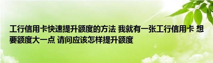 导读 大家好,小元来为大家解答问题。工行信用卡快速提升额度的方法,我就有一张工行信用卡,想要额度大一点,请问应该怎样提升额度这个很多人还