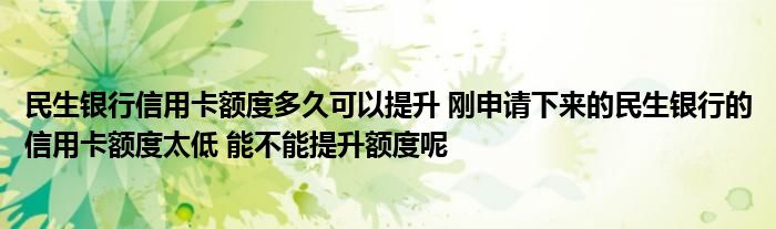 导读 大家好,小元来为大家解答问题。民生银行信用卡额度多久可以提升,刚申请下来的民生银行的信用卡额度太低,能不能提升额度呢这个很多人还不
