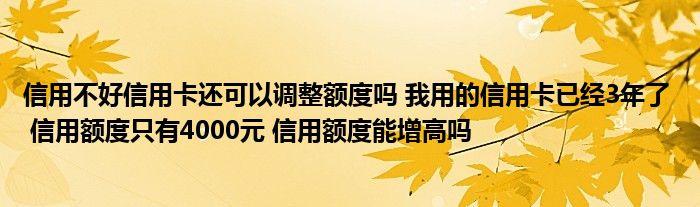 导读 大家好,小元来为大家解答问题。信用不好信用卡还可以调整额度吗,我用的信用卡已经3年了,,信用额度只有4000元,信用额度能增高吗这个很