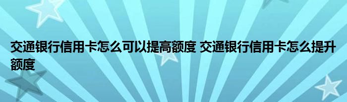 导读 大家好,小元来为大家解答问题。交通银行信用卡怎么可以提高额度,交通银行信用卡怎么提升额度这个很多人还不知道,现在让我们一起来了解下