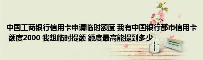 导读 大家好,小元来为大家解答问题。中国工商银行信用卡申请临时额度,我有中国银行都市信用卡,额度2000,我想临时提额,额度最高能提到多少这