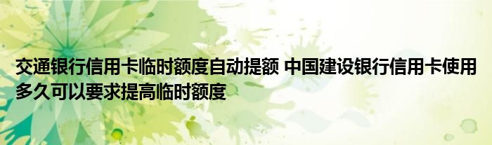 导读 大家好,小元来为大家解答问题。交通银行信用卡临时额度自动提额,中国建设银行信用卡使用多久可以要求提高临时额度这个很多人还不知道,现