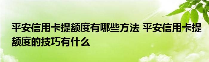 导读 大家好,小元来为大家解答问题。平安信用卡提额度有哪些方法,平安信用卡提额度的技巧有什么这个很多人还不知道,现在让我们一起来了解下吧