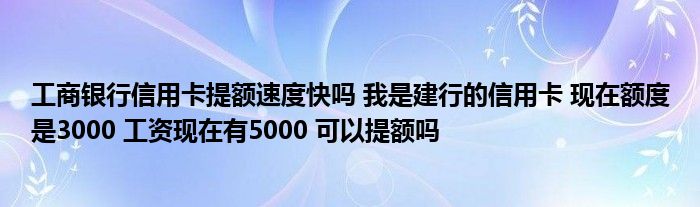 导读 大家好,小元来为大家解答问题。工商银行信用卡提额速度快吗,我是建行的信用卡,现在额度是3000,工资现在有5000,可以提额吗这个很多人还