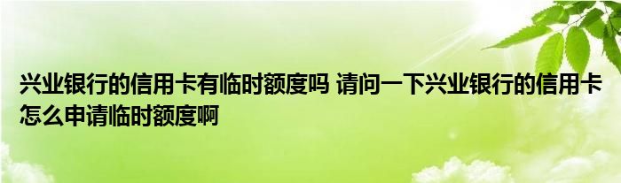 导读 大家好,小元来为大家解答问题。兴业银行的信用卡有临时额度吗,请问一下兴业银行的信用卡怎么申请临时额度啊这个很多人还不知道,现在让我