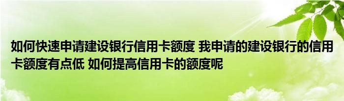 大家好,小元来为大家解答问题。如何快速申请建设银行信用卡额度,我申请的建设银行的信用卡额度有点低,如何提高信用卡的额度呢这个很多人还不知道,现在让我们一起来了解下吧!