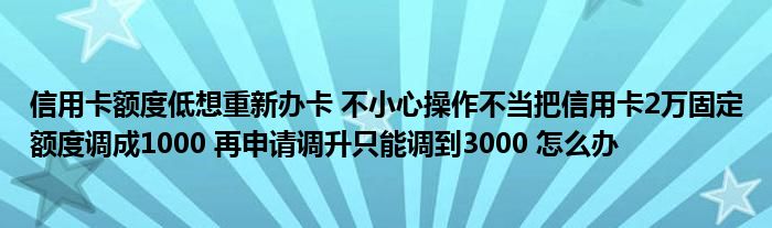 导读 大家好,小元来为大家解答问题。信用卡额度低想重新办卡,不小心操作不当把信用卡2万固定额度调成1000,再申请调升只能调到3000,怎么办这