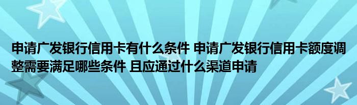 导读 大家好,小元来为大家解答问题。申请广发银行信用卡有什么条件,申请广发银行信用卡额度调整需要满足哪些条件,且应通过什么渠道申请这个很
