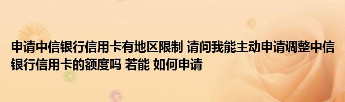 导读 大家好,小元来为大家解答问题。申请中信银行信用卡有地区限制,请问我能主动申请调整中信银行信用卡的额度吗,若能,如何申请这个很多人还