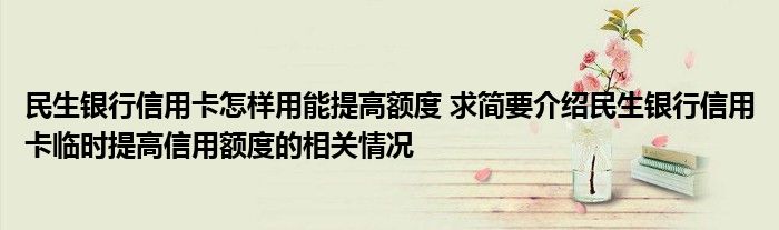 导读 大家好,小元来为大家解答问题。民生银行信用卡怎样用能提高额度,求简要介绍民生银行信用卡临时提高信用额度的相关情况这个很多人还不知道