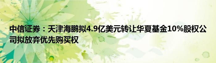 以上就是【中信证券:天津海鹏拟4.9亿美元转让华夏基金10%股权公司拟放弃优先购买权】相关内容。
