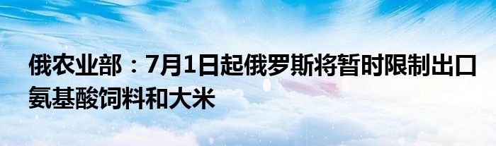 7月1日电,俄罗斯农业部发表声明称,从7月1日至12月31日,俄罗斯将暂时限制出口氨基酸饲料和大米。俄农业部表示,该决定目的为确保俄罗斯粮食安全,保证俄罗斯国内这些产品的价格稳定以及支持俄罗斯畜牧业和加工行业。